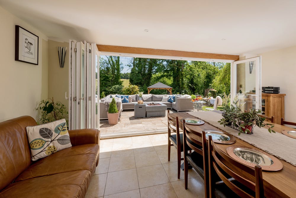 The kitchen just lends itself to sociable holidays and weekends away for large groups; room to sing and dance, bifold doors that open onto the terrace, and a long chunky table just waiting for that sensational celebration feast. These will be happy days indeed! When the weather’s warm enough you can sit outside and enjoy the peace and quiet; lie back in the hot tub and soak it all up - the birds twittering away in the treetops, the stream merrily babbling along the hedgeline, and the contented lowing of the cows that graze on the hill.